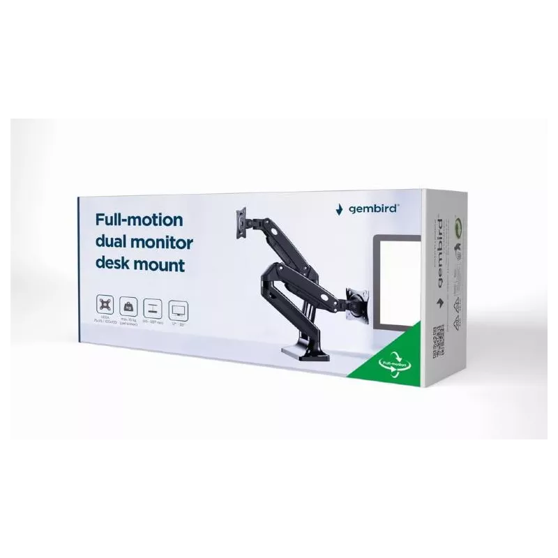 - GEMBIRD MA-DA2-03. MOUNTING: CLAMP, MAXIMUM WEIGHT CAPACITY: 20 KG, MINIMUM SCREEN SIZE: 43.2 CM (17"), MAXIMUM SCREEN SIZE: 88.9 CM (35"), MINIMUM VESA MOUNT: 75 X 75 MM, MAXIMUM VESA MOUNT: 100 X 100 MM. TILT ANGLE RANGE: -50 - 50 . PRODUCT COLOUR: BLAC