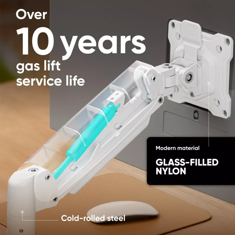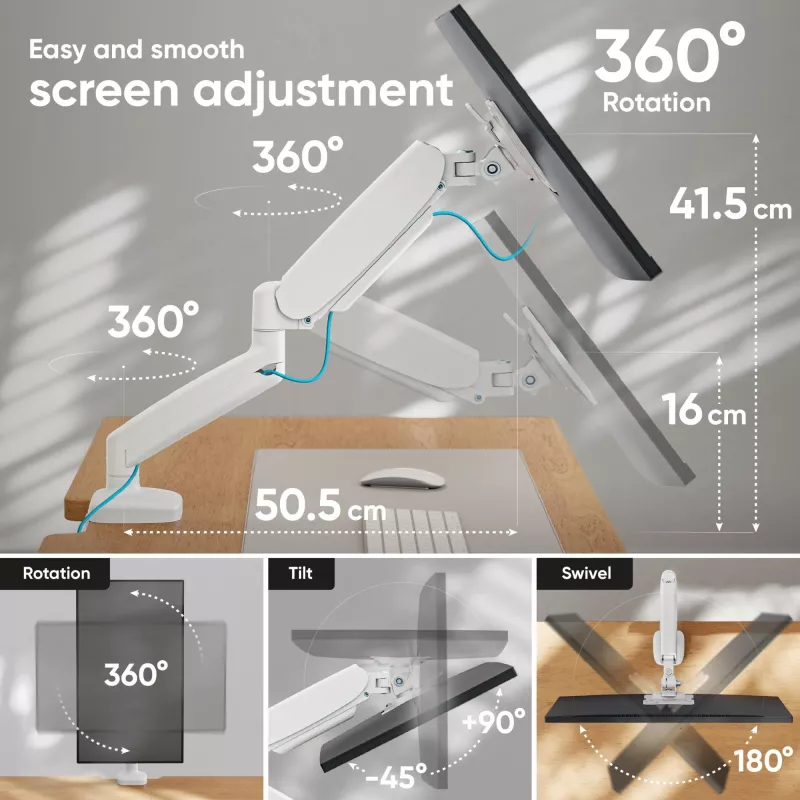 1xNumber of displays supported , Maximum weight capacity (per display) 8 kg , Maximum weight capacity 8 kg , Maximum screen size 81.3 cm (32") , Mounting type Desk , Minimum VESA mount 75 x 75 mm , Maximum VESA mount 100 x 100 mm , Height adjustment Yes , Tilt adjustment Yes , Swivelling Yes , Rotating Yes , Colour White , Orientation Landscape/Portrait , Clamp included Yes