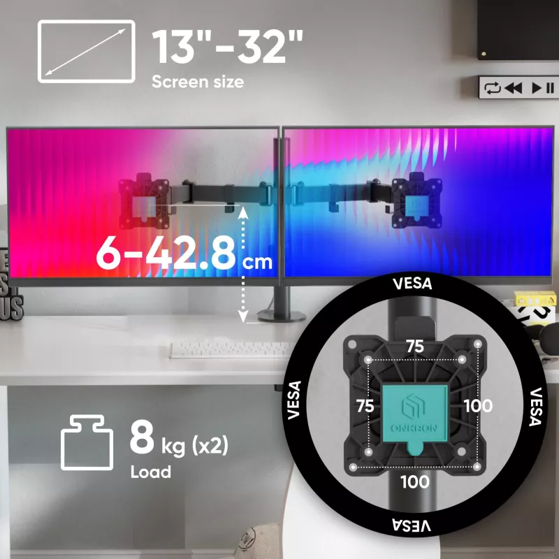 - ONKRON D221E-B. MOUNTING: CLAMP/GROMMET, MAXIMUM WEIGHT CAPACITY: 16 KG, MINIMUM SCREEN SIZE: 33 CM (13"), MAXIMUM SCREEN SIZE: 81.3 CM (32"), MINIMUM VESA MOUNT: 75 X 75 MM, MAXIMUM VESA MOUNT: 100 X 100 MM. HEIGHT ADJUSTMENT, TILT ANGLE RANGE: -45 - 45