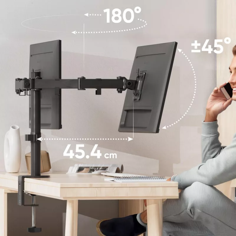 2xNumber of displays supported , Maximum weight capacity (per display) 8 kg , Maximum weight capacity 16 kg , Maximum screen size 81.3 cm (32") , Mounting type Desk , Minimum VESA mount 75 x 75 mm , Maximum VESA mount 100 x 100 mm , Height adjustment Yes , Tilt adjustment Yes , Rotating Yes , Colour Black , Orientation Landscape/Portrait