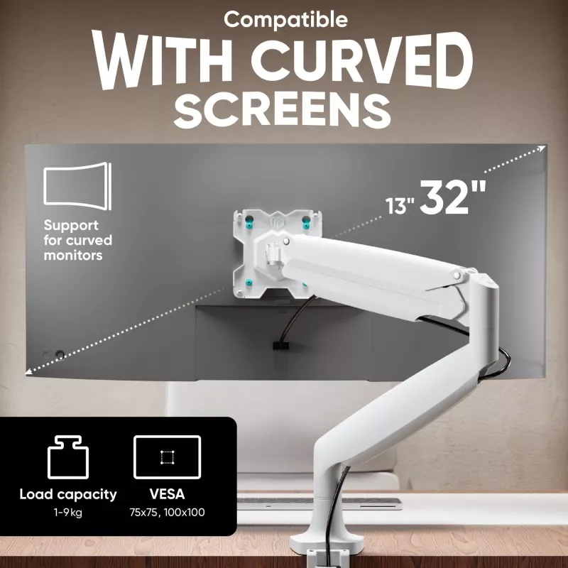 1xNumber of displays supported , Maximum weight capacity (per display) 9 kg , Maximum weight capacity 9 kg , Maximum screen size 81.3 cm (32") , Mounting type Desk , Minimum VESA mount 75 x 75 mm , Maximum VESA mount 100 x 100 mm , Height adjustment Yes , Tilt adjustment Yes , Swivelling Yes , Rotating Yes , Colour White , Orientation Landscape/Portrait