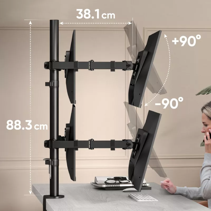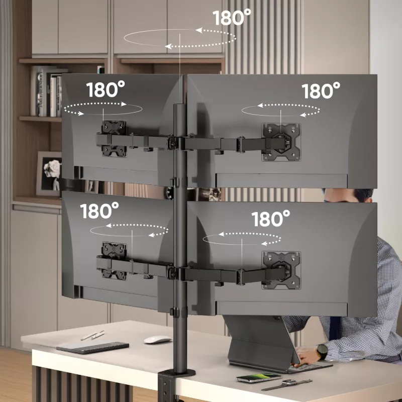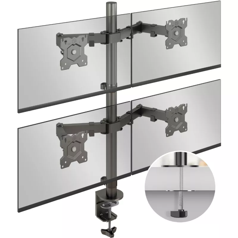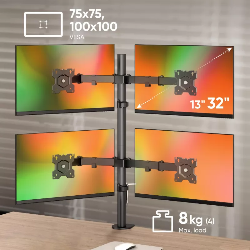 4xNumber of displays supported , Maximum weight capacity (per display) 8 kg , Maximum weight capacity 32 kg , Maximum screen size 81.3 cm (32") , Mounting type Desk , Minimum VESA mount 75 x 75 mm , Maximum VESA mount 100 x 100 mm , Height adjustment Yes , Tilt adjustment Yes , Swivelling Yes , Rotating Yes , Colour Black , Orientation Landscape/Portrait