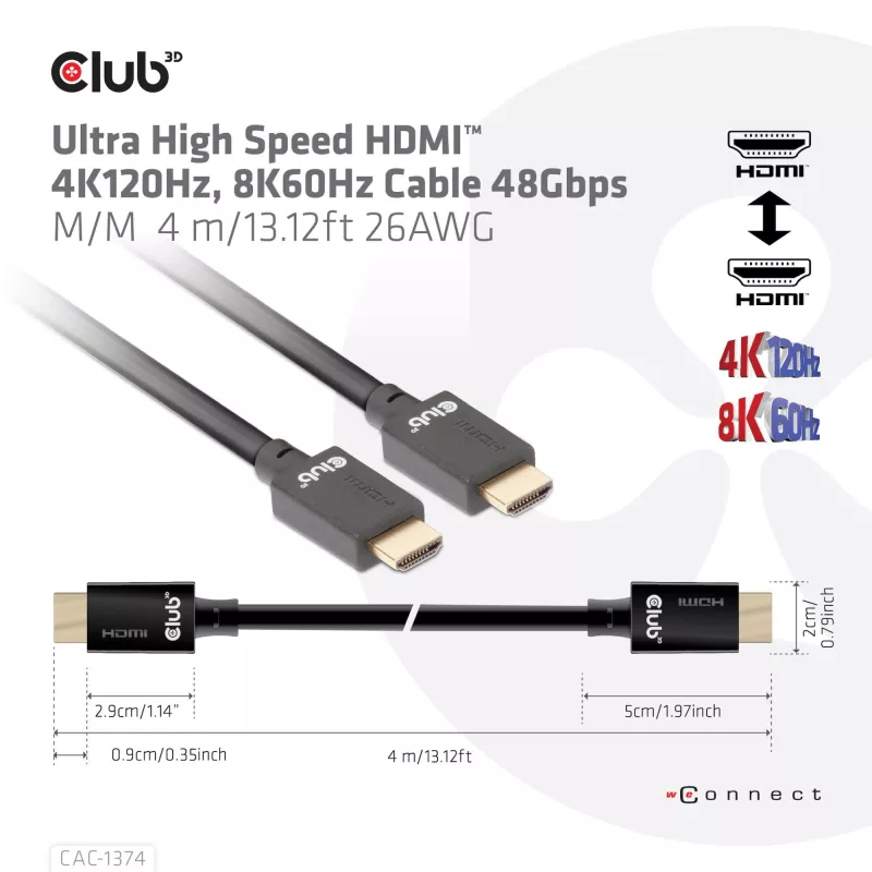 - CLUB3D ULTRA HIGH SPEED HDMI 4K120HZ, 8K60HZ CABLE 48GBPS M/M 4 M/13.12FT 26AWG. CABLE LENGTH: 4 M, CONNECTOR 1: HDMI TYPE A (STANDARD), CONNECTOR 1 GENDER: MALE, CONNECTOR 2: HDMI TYPE A (STANDARD), CONNECTOR 2 GENDER: MALE, CONNECTOR CONTACTS PLATING: G