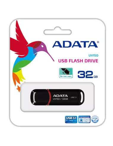 - ADATA AUV150-32G-RBK. CAPACITY: 32 GB, DEVICE INTERFACE: USB TYPE-A, USB VERSION: 3.2 GEN 1 (3.1 GEN 1), READ SPEED: 90 MB/S, WRITE SPEED: 25 MB/S. FORM FACTOR: CAP. WEIGHT: 9 G. PRODUCT COLOUR: BLACK