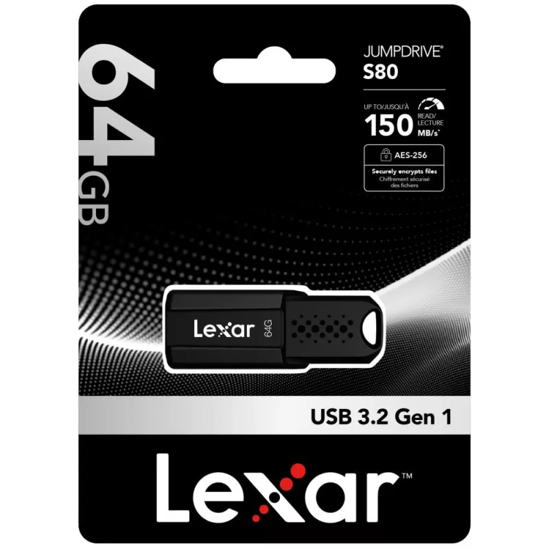 - LEXAR JUMPDRIVE S80. CAPACITY: 64 GB, DEVICE INTERFACE: USB TYPE-A, USB VERSION: 3.2 GEN 1 (3.1 GEN 1), READ SPEED: 150 MB/S, WRITE SPEED: 60 MB/S. FORM FACTOR: SLEEVE. WEIGHT: 19 G. PRODUCT COLOUR: BLACK