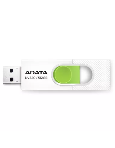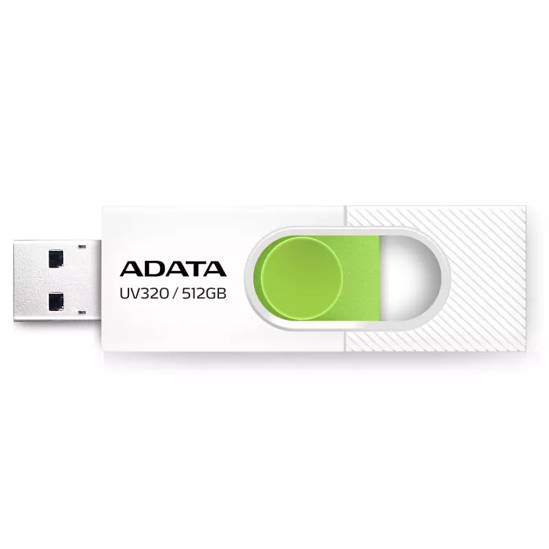 - ADATA UV320. CAPACITY: 512 GB, DEVICE INTERFACE: USB TYPE-A, USB VERSION: 3.2 GEN 1 (3.1 GEN 1), READ SPEED: 100 MB/S. FORM FACTOR: SLIDE. WEIGHT: 7.9 G. PRODUCT COLOUR: GREEN, WHITE