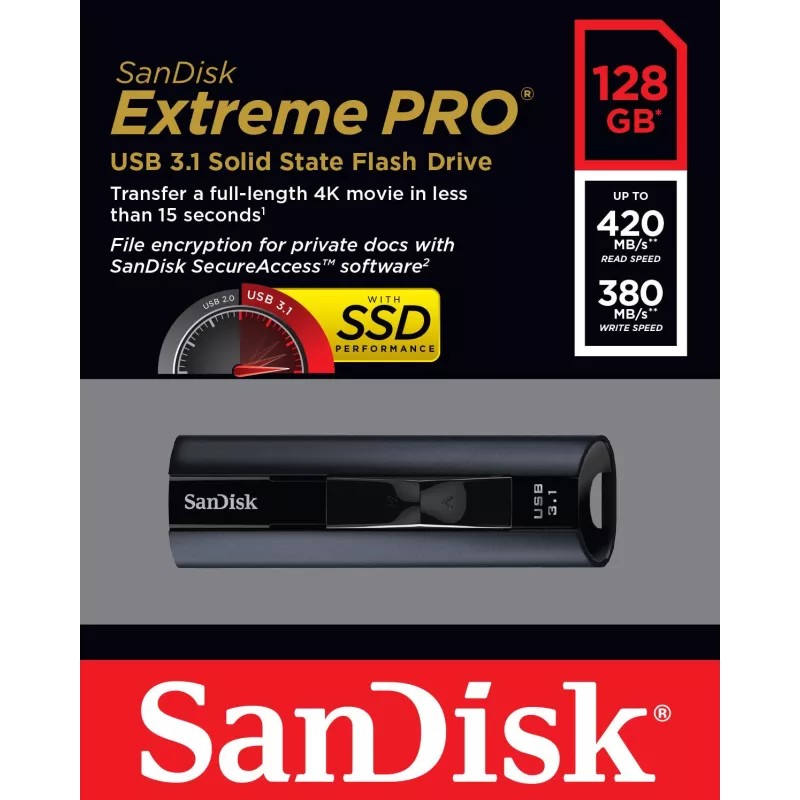 - SANDISK EXTREME PRO. CAPACITY: 128 GB, DEVICE INTERFACE: USB TYPE-A, USB VERSION: 3.2 GEN 1 (3.1 GEN 1), READ SPEED: 420 MB/S, WRITE SPEED: 380 MB/S. FORM FACTOR: SLIDE. PASSWORD PROTECTION. WEIGHT: 17 G. PRODUCT COLOUR: BLACK