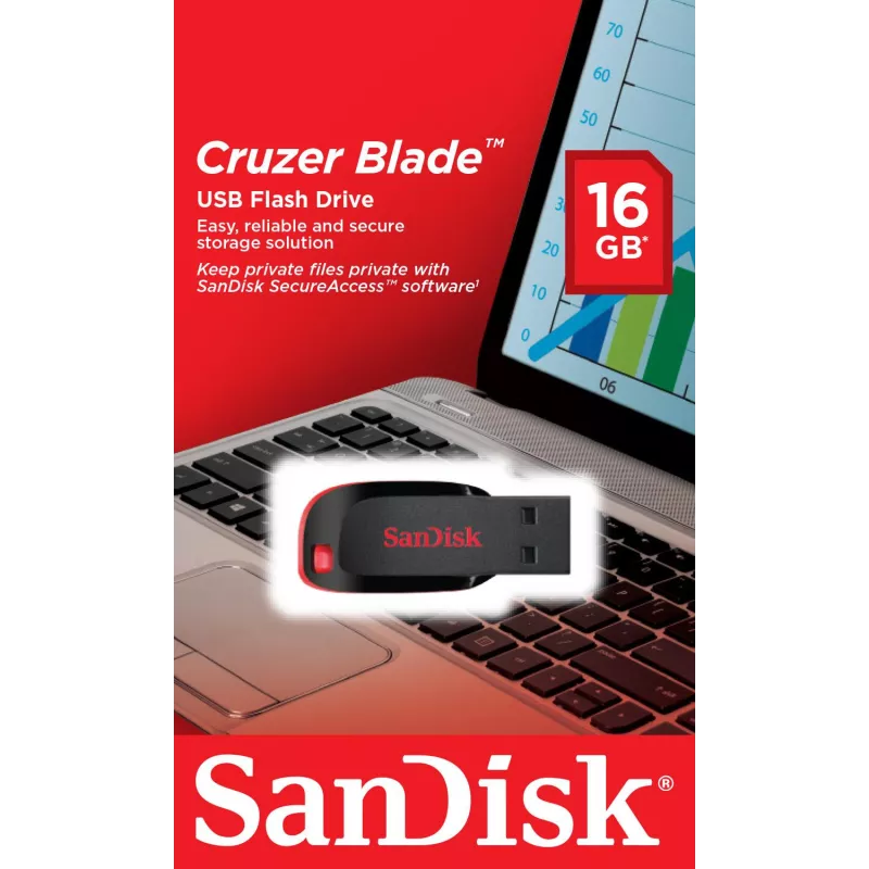 - SANDISK CRUZER BLADE. CAPACITY: 16 GB, DEVICE INTERFACE: USB TYPE-A, USB VERSION: 2.0. FORM FACTOR: CAPLESS. WEIGHT: 2.5 G. PRODUCT COLOUR: BLACK, RED