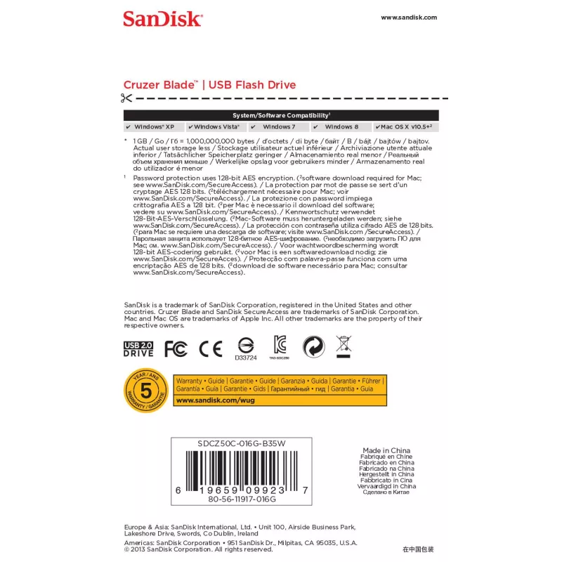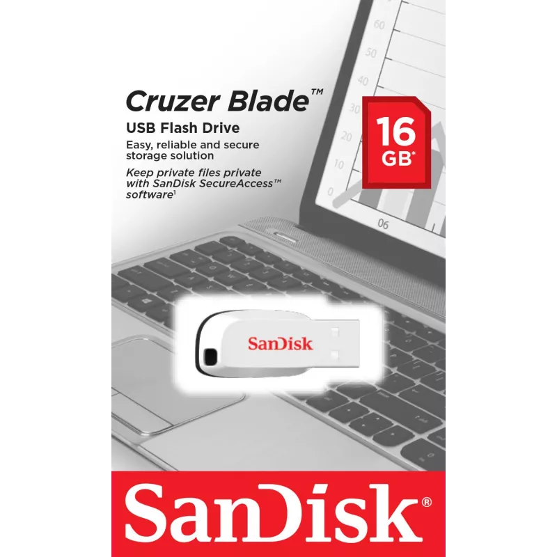 - SANDISK CRUZER BLADE. CAPACITY: 16 GB, DEVICE INTERFACE: USB TYPE-A, USB VERSION: 2.0. FORM FACTOR: CAPLESS. WEIGHT: 2.5 G. PRODUCT COLOUR: WHITE