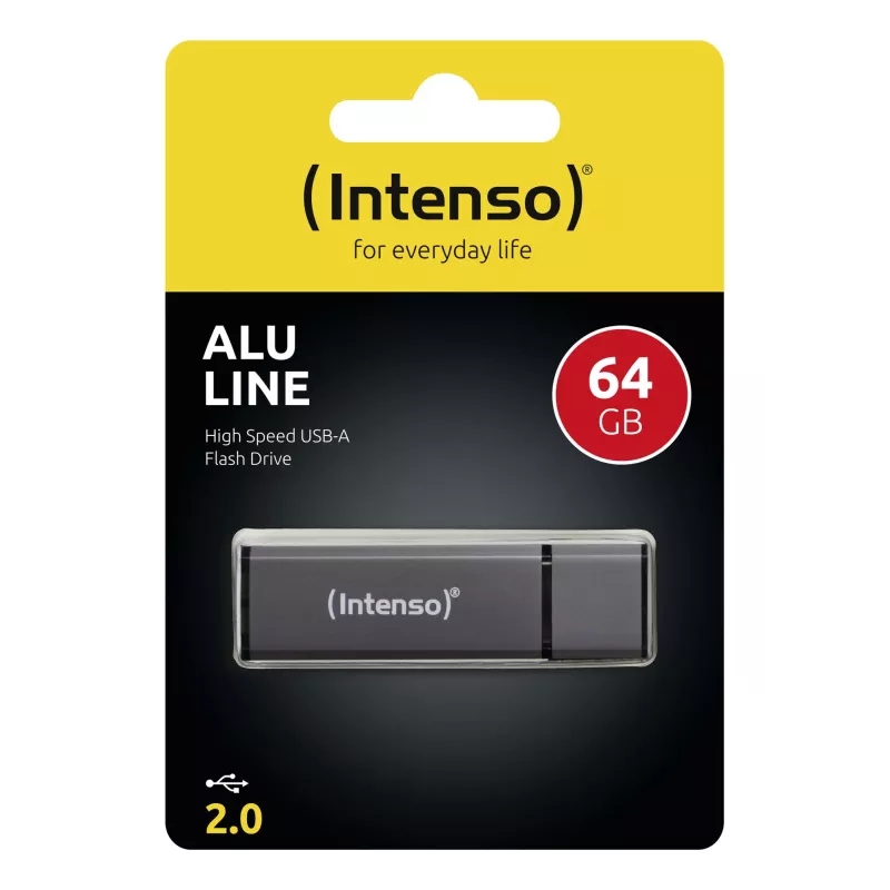 - INTENSO ALU LINE. CAPACITY: 64 GB, DEVICE INTERFACE: USB TYPE-A, USB VERSION: 2.0, READ SPEED: 28 MB/S, WRITE SPEED: 6.5 MB/S. FORM FACTOR: CAP. WEIGHT: 8 G. PRODUCT COLOUR: ANTHRACITE