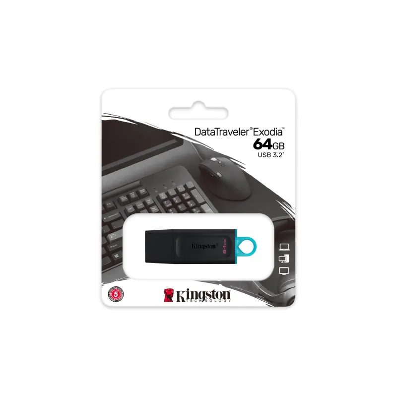 - KINGSTON TECHNOLOGY DATATRAVELER EXODIA - USB 3.2 FLASH DRIVE. CAPACITY: 64 GB, DEVICE INTERFACE: USB TYPE-A, USB VERSION: 3.2 GEN 1 (3.1 GEN 1). FORM FACTOR: CAP. WEIGHT: 11 G. PRODUCT COLOUR: BLACK, TURQUOISE