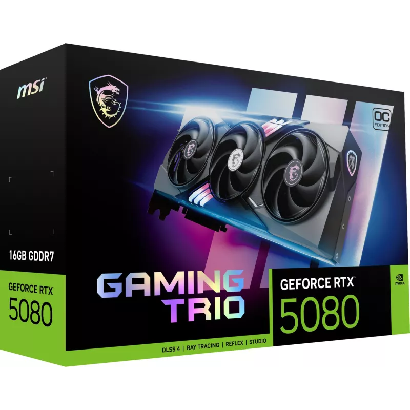 MSI GAMING GEFORCE RTX 5080 16G TRIO OC. GRAPHICS PROCESSOR FAMILY: NVIDIA, GRAPHICS PROCESSOR: GEFORCE RTX 5080. DISCRETE GRAPHICS CARD MEMORY: 16 GB, GRAPHICS CARD MEMORY TYPE: GDDR7, MEMORY BUS: 256 BIT, MEMORY CLOCK SPEED: 30000 MHZ. MAXIMUM RESOLUTIO