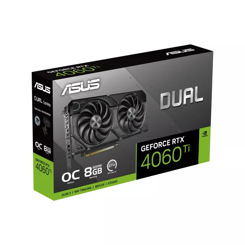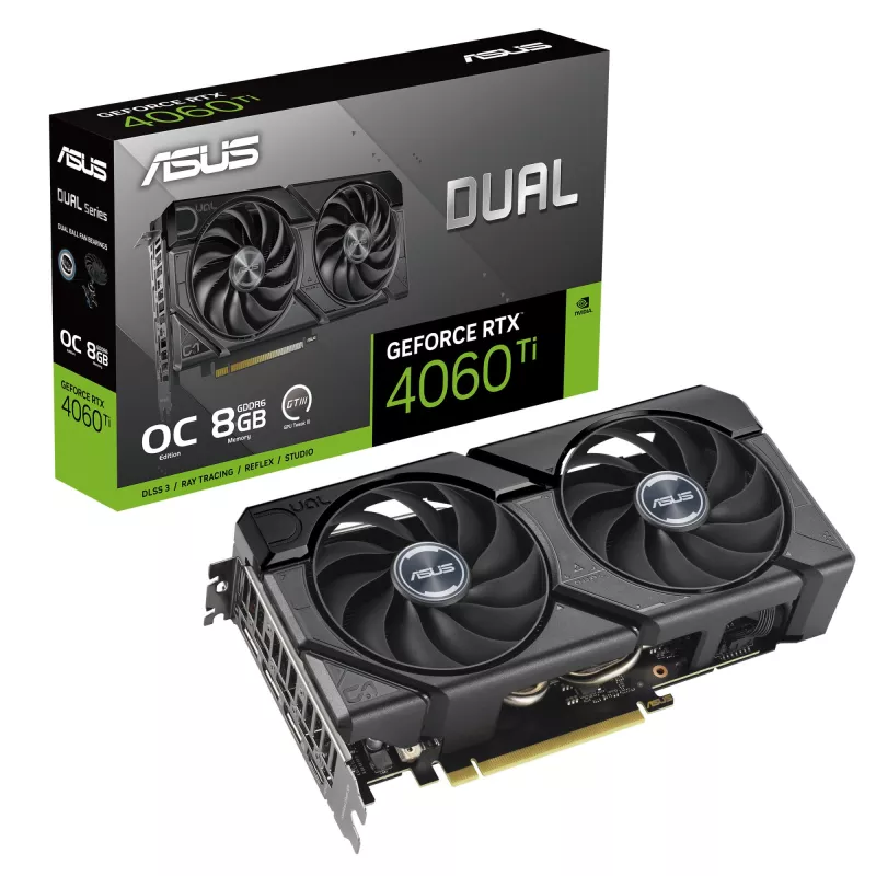 ASUS DUAL -RTX4060TI-O8G-EVO. GRAPHICS PROCESSOR FAMILY: NVIDIA, GRAPHICS PROCESSOR: GEFORCE RTX 4060 TI. DISCRETE GRAPHICS CARD MEMORY: 8 GB, GRAPHICS CARD MEMORY TYPE: GDDR6, MEMORY BUS: 128 BIT. MAXIMUM RESOLUTION: 7680 X 4320 PIXELS. DIRECTX VERSION: