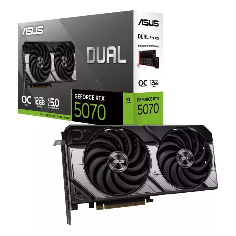 ASUS DUAL -RTX5070-O12G. GRAPHICS PROCESSOR FAMILY: NVIDIA, GRAPHICS PROCESSOR: GEFORCE RTX 5070. DISCRETE GRAPHICS CARD MEMORY: 12 GB, GRAPHICS CARD MEMORY TYPE: GDDR7, MEMORY BUS: 192 BIT. MAXIMUM RESOLUTION: 7680 X 4320 PIXELS. OPENGL VERSION: 4.6. INT
