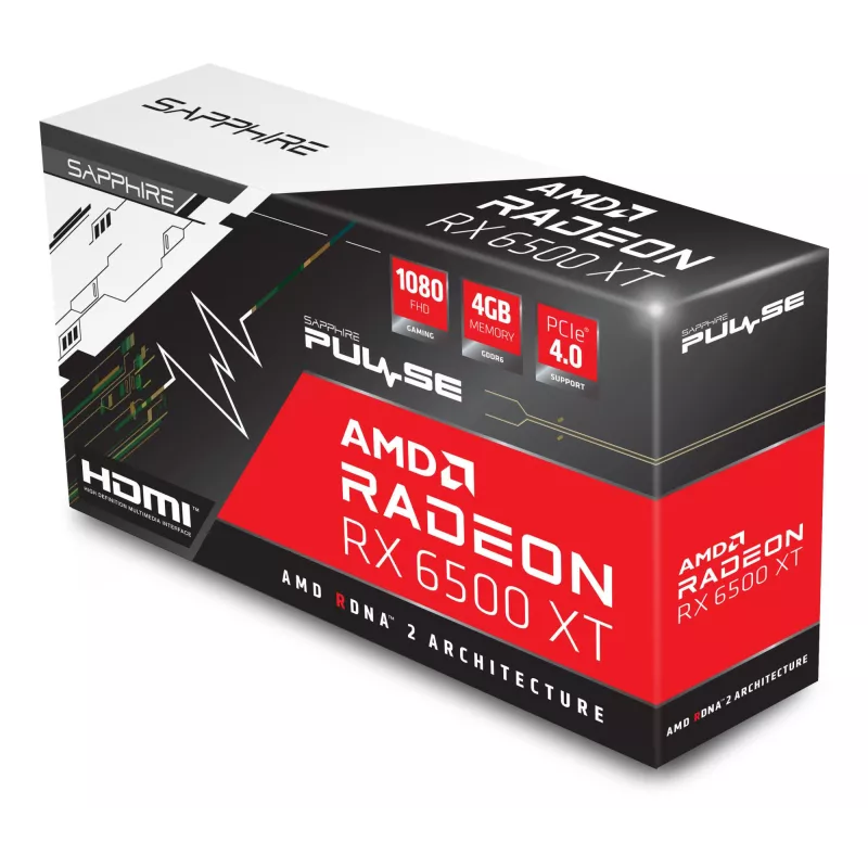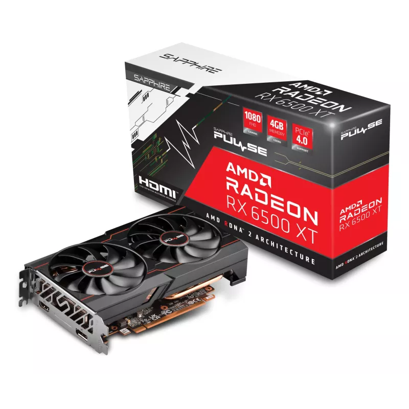 SAPPHIRE PULSE RADEON RX 6500 XT. GRAPHICS PROCESSOR FAMILY: AMD, GRAPHICS PROCESSOR: RADEON RX 6500 XT. DISCRETE GRAPHICS CARD MEMORY: 4 GB, GRAPHICS CARD MEMORY TYPE: GDDR6, MEMORY BUS: 64 BIT. MAXIMUM RESOLUTION: 7680 X 4320 PIXELS. DIRECTX VERSION: 12