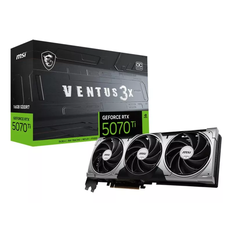 MSI GEFORCE RTX 5070 TI 16G VENTUS 3X OC. GRAPHICS PROCESSOR FAMILY: NVIDIA, GRAPHICS PROCESSOR: GEFORCE RTX 5070 TI, PROCESSOR FREQUENCY: 2497 MHZ. DISCRETE GRAPHICS CARD MEMORY: 16 GB, GRAPHICS CARD MEMORY TYPE: GDDR7, MEMORY BUS: 256 BIT. MAXIMUM RESOL