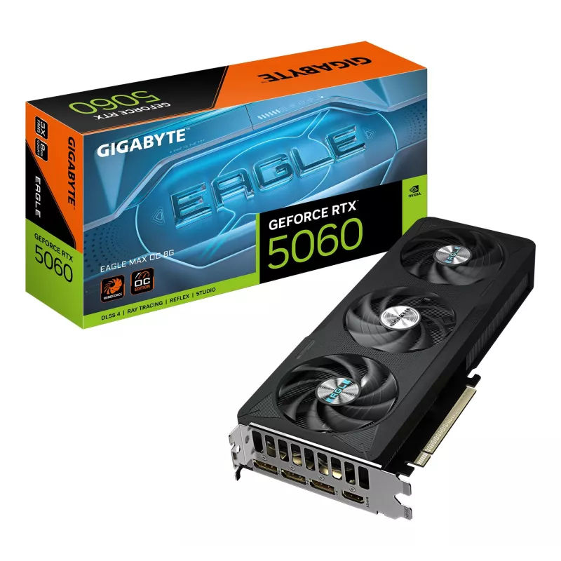 GIGABYTE GEFORCE RTX 5060 EAGLE MAX OC 8G GRAPHICS CARD - 8GB GDDR7, 128BIT, PCI-E 5.0, 2550 MHZ CORE CLOCK, 3 X DISPLAYPORT, 1 X HDMI, NVIDIA DLSS 4, GV-N5060EAGLEMAX OC-8GD 1.0. GRAPHICS PROCESSOR FAMILY: NVIDIA, GRAPHICS PROCESSOR: GEFORCE RTX 5060, PR