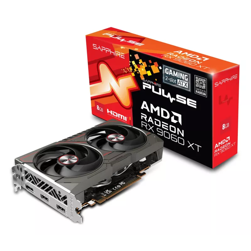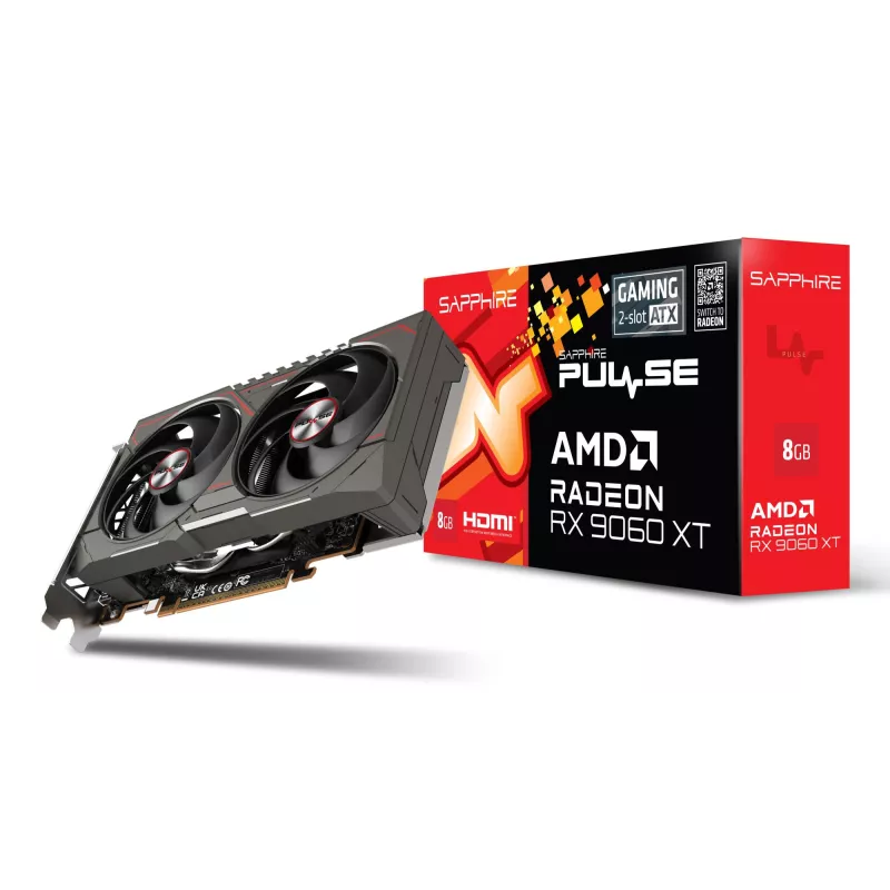 SAPPHIRE PULSE RADEON RX 9060 XT. GRAPHICS PROCESSOR FAMILY: AMD, GRAPHICS PROCESSOR: RADEON RX 9060 XT. DISCRETE GRAPHICS CARD MEMORY: 8 GB, GRAPHICS CARD MEMORY TYPE: GDDR6, MEMORY BUS: 128 BIT. MAXIMUM RESOLUTION: 7680 X 4320 PIXELS. DIRECTX VERSION: 1