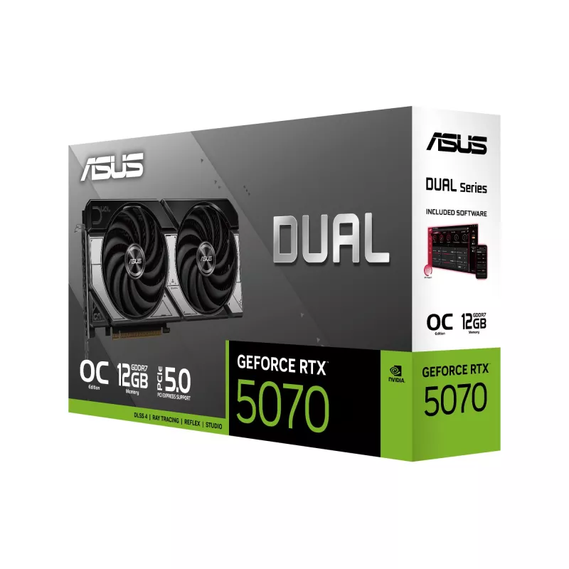 ASUS DUAL -RTX5070-O12G. GRAPHICS PROCESSOR FAMILY: NVIDIA, GRAPHICS PROCESSOR: GEFORCE RTX 5070. DISCRETE GRAPHICS CARD MEMORY: 12 GB, GRAPHICS CARD MEMORY TYPE: GDDR7, MEMORY BUS: 192 BIT. MAXIMUM RESOLUTION: 7680 X 4320 PIXELS. OPENGL VERSION: 4.6. INT