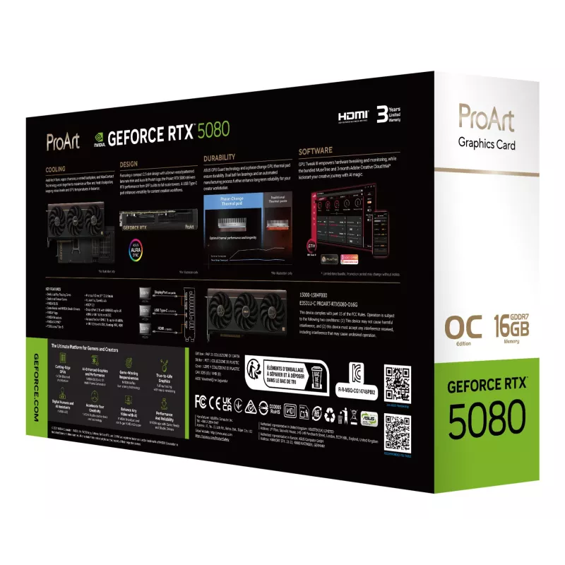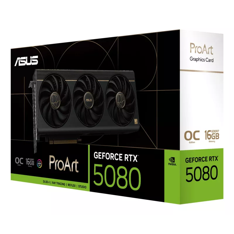 - ASUS PROART -RTX5080-O16G. GRAPHICS PROCESSOR FAMILY: NVIDIA, GRAPHICS PROCESSOR: GEFORCE RTX 5080. DISCRETE GRAPHICS CARD MEMORY: 16 GB, GRAPHICS CARD MEMORY TYPE: GDDR7, MEMORY BUS: 256 BIT. MAXIMUM RESOLUTION: 7680 X 4320 PIXELS. DIRECTX VERSION: 12 UL