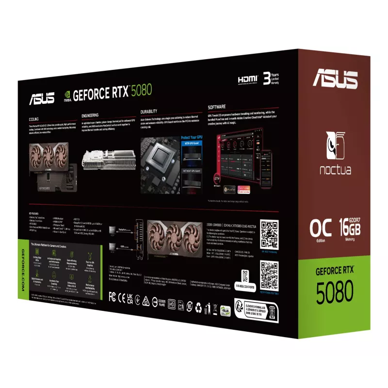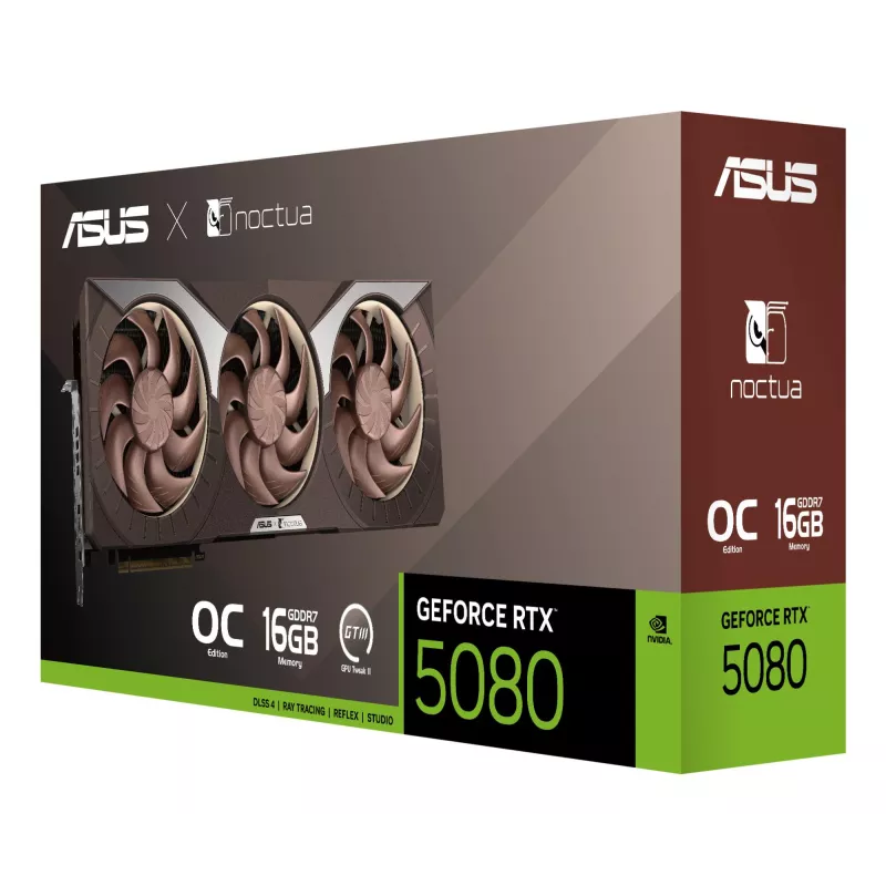ASUS RTX5080-O16G-NOCTUA. GRAPHICS PROCESSOR FAMILY: NVIDIA, GRAPHICS PROCESSOR: GEFORCE RTX 5080. DISCRETE GRAPHICS CARD MEMORY: 16 GB, GRAPHICS CARD MEMORY TYPE: GDDR7, MEMORY BUS: 256 BIT. MAXIMUM RESOLUTION: 7680 X 4320 PIXELS. DIRECTX VERSION: 12 ULT
