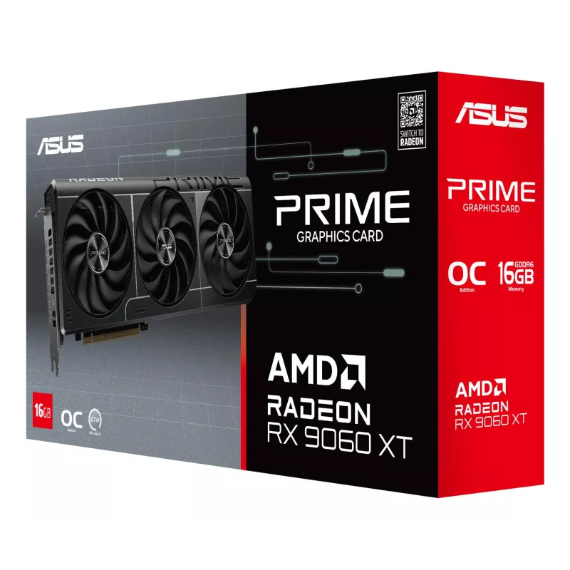 ASUS PRIME RADEON RX 9060 XT O16G. GRAPHICS PROCESSOR FAMILY: AMD, GRAPHICS PROCESSOR: RADEON RX 9060 XT. DISCRETE GRAPHICS CARD MEMORY: 16 GB, GRAPHICS CARD MEMORY TYPE: GDDR6, MEMORY BUS: 128 BIT. MAXIMUM RESOLUTION: 7680 X 4320 PIXELS. OPENGL VERSION: