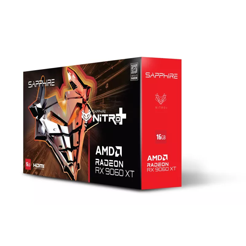 SAPPHIRE NITRO+ AMD RADEON RX 9060 XT GPU. GRAPHICS PROCESSOR FAMILY: AMD, GRAPHICS PROCESSOR: RADEON RX 9060 XT. DISCRETE GRAPHICS CARD MEMORY: 16 GB, GRAPHICS CARD MEMORY TYPE: GDDR6, MEMORY BUS: 128 BIT. MAXIMUM RESOLUTION: 7680 X 4320 PIXELS. DIRECTX