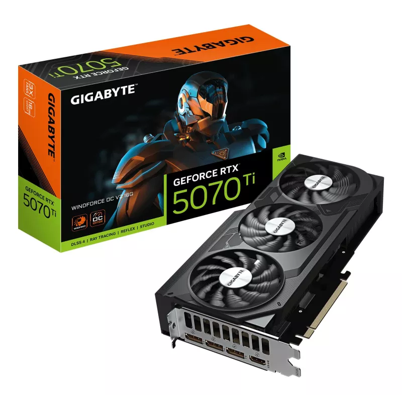- GIGABYTE GEFORCE RTX 5070 TI WINDFORCE OC V2 16G GRAPHICS CARD - 16GB GDDR6, 256BIT, PCI-E 5.0, 2497 MHZ CORE CLOCK, 3 X DISPLAYPORT, 1 X HDMI, GV-N507TWF3OCV2-16GD. GRAPHICS PROCESSOR FAMILY: NVIDIA, GRAPHICS PROCESSOR: GEFORCE RTX 5070 TI, PROCESSOR FRE