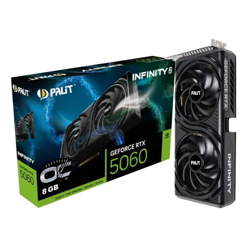 PALIT GEFORCE RTX 5060 INFINITY 2 OC. GRAPHICS PROCESSOR FAMILY: NVIDIA, GRAPHICS PROCESSOR: GEFORCE RTX 5060, PROCESSOR FREQUENCY: 2280 MHZ. DISCRETE GRAPHICS CARD MEMORY: 8 GB, GRAPHICS CARD MEMORY TYPE: GDDR7, MEMORY BUS: 128 BIT. MAXIMUM RESOLUTION: 7
