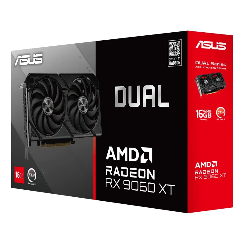 ASUS DUAL -RX9060XT-16G. GRAPHICS PROCESSOR FAMILY: AMD, GRAPHICS PROCESSOR: RADEON RX 9060 XT. DISCRETE GRAPHICS CARD MEMORY: 16 GB, GRAPHICS CARD MEMORY TYPE: GDDR6, MEMORY BUS: 128 BIT. MAXIMUM RESOLUTION: 7680 X 4320 PIXELS. DIRECTX VERSION: 12 ULTIMA
