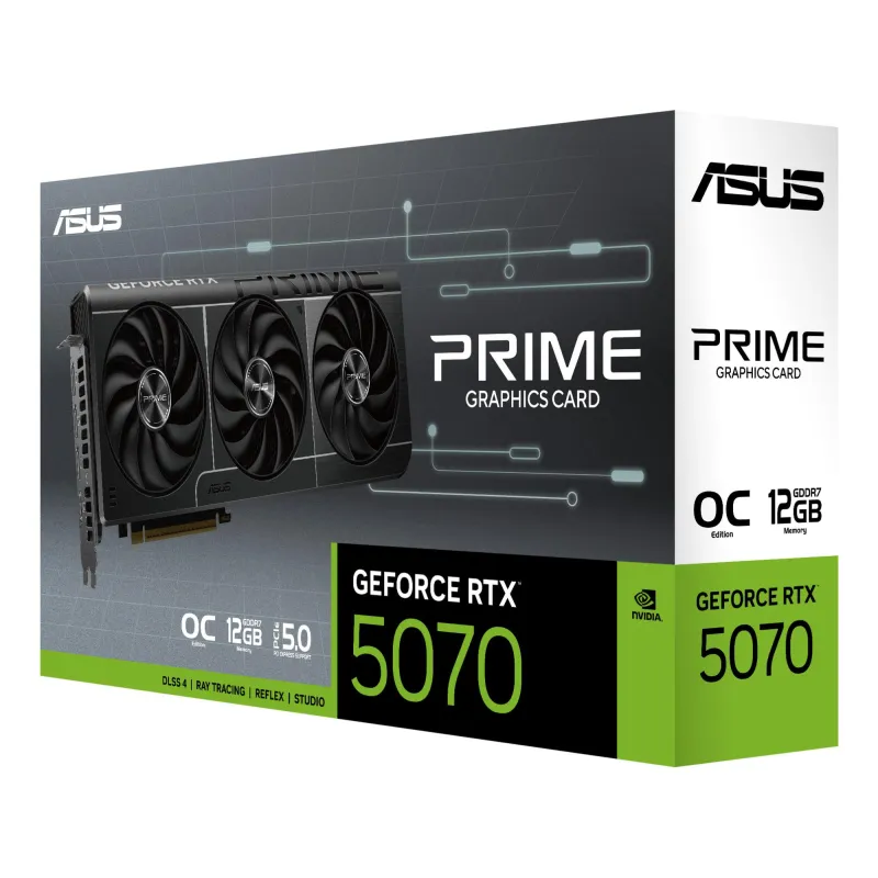 - ASUS PRIME -RTX5070-O12G. GRAPHICS PROCESSOR FAMILY: NVIDIA, GRAPHICS PROCESSOR: GEFORCE RTX 5070. DISCRETE GRAPHICS CARD MEMORY: 12 GB, GRAPHICS CARD MEMORY TYPE: GDDR7, MEMORY BUS: 192 BIT. MAXIMUM RESOLUTION: 7680 X 4320 PIXELS. DIRECTX VERSION: 12 ULT