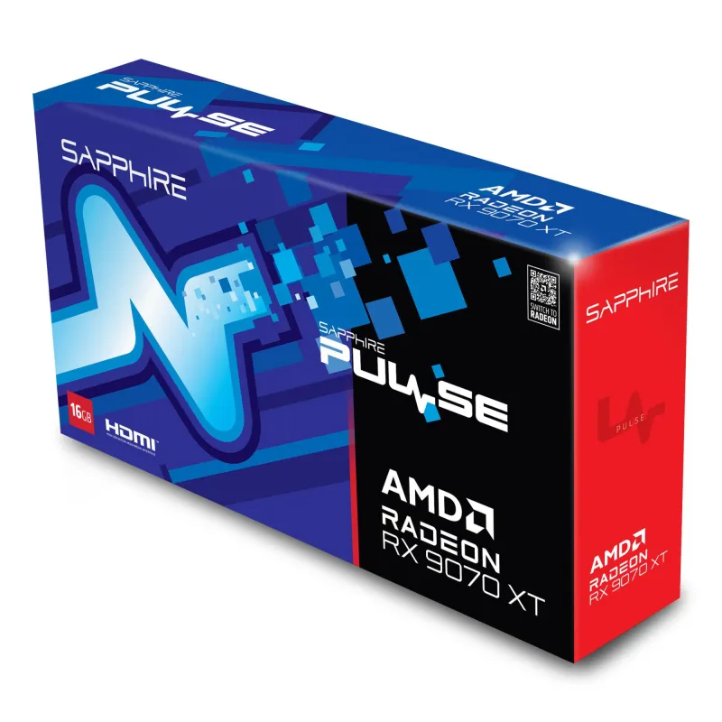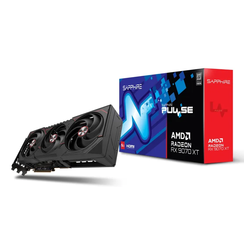 SAPPHIRE PULSE RADEON RX 9070 XT. GRAPHICS PROCESSOR FAMILY: AMD, GRAPHICS PROCESSOR: RADEON RX 9070 XT. DISCRETE GRAPHICS CARD MEMORY: 16 GB, GRAPHICS CARD MEMORY TYPE: GDDR6, MEMORY BUS: 256 BIT. MAXIMUM RESOLUTION: 7680 X 4320 PIXELS. DIRECTX VERSION: