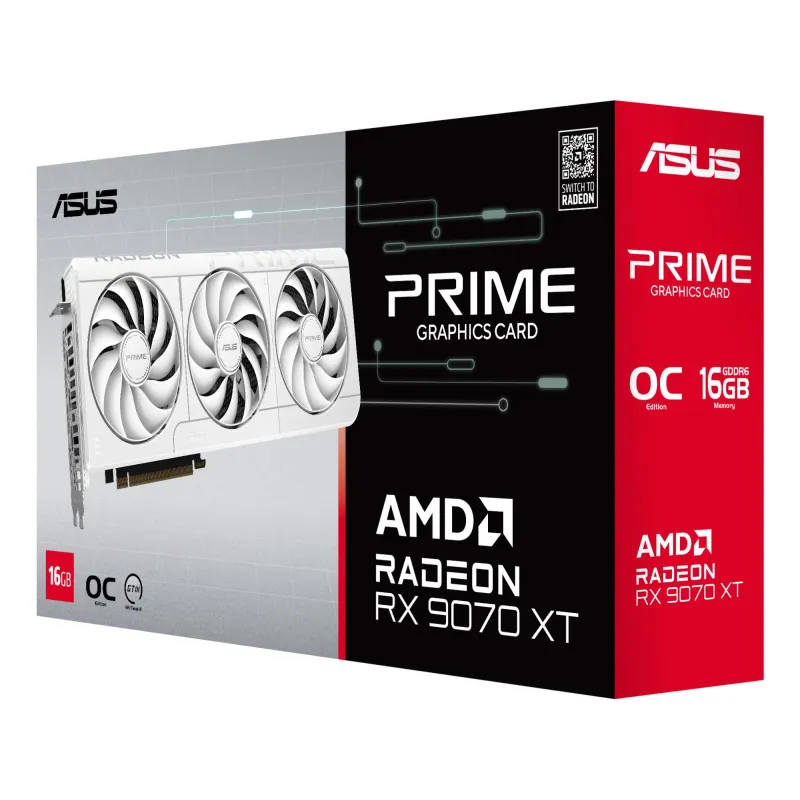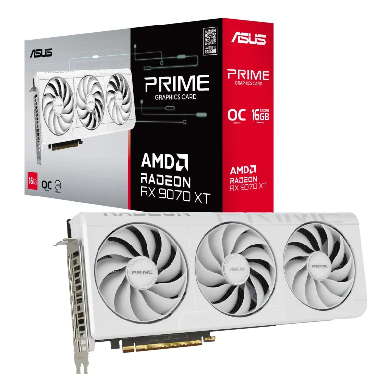 ASUS PRIME -RX9070XT-O16G-WHITE. GRAPHICS PROCESSOR FAMILY: AMD, GRAPHICS PROCESSOR: RADEON RX 9070 XT, PROCESSOR FREQUENCY: 2460 MHZ. DISCRETE GRAPHICS CARD MEMORY: 16 GB, GRAPHICS CARD MEMORY TYPE: GDDR6, MEMORY BUS: 256 BIT. MAXIMUM RESOLUTION: 7680 X