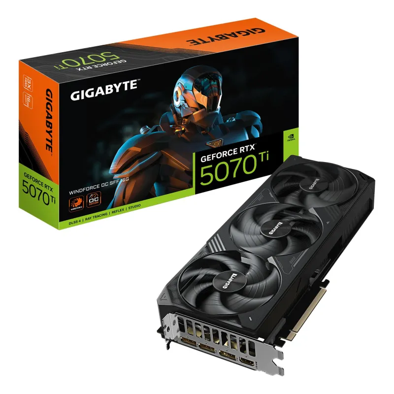 GIGABYTE GEFORCE RTX 5070 TI WINDFORCE OC SFF 16G GRAPHICS CARD - 16GB GDDR7, 256BIT, PCI-E 5.0, 2497 MHZ CORE CLOCK, 3 X DP 2.1A, 1 X HDMI 2.1B, NVIDIA DLSS 4, GV-N507TWF3OC-16GD. GRAPHICS PROCESSOR FAMILY: NVIDIA, GRAPHICS PROCESSOR: GEFORCE RTX 5070 TI