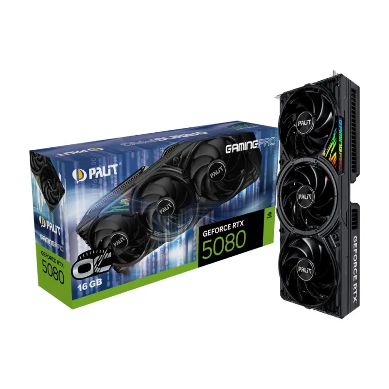 PALIT GEFORCE RTX 5080 GAMINGPRO OC. GRAPHICS PROCESSOR FAMILY: NVIDIA, GRAPHICS PROCESSOR: GEFORCE RTX 5080, PROCESSOR FREQUENCY: 2295 MHZ. DISCRETE GRAPHICS CARD MEMORY: 16 GB, GRAPHICS CARD MEMORY TYPE: GDDR7, MEMORY BUS: 256 BIT. MAXIMUM RESOLUTION: 7