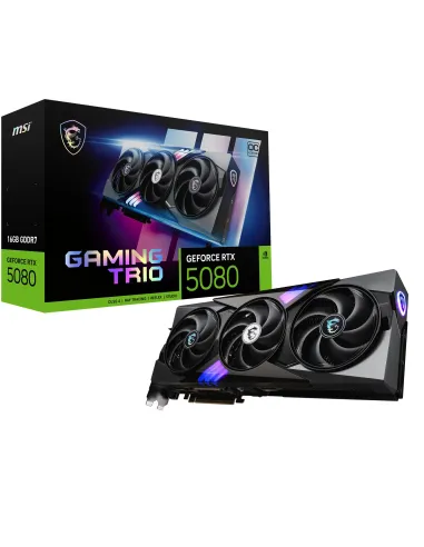MSI GAMING GEFORCE RTX 5080 16G TRIO OC. GRAPHICS PROCESSOR FAMILY: NVIDIA, GRAPHICS PROCESSOR: GEFORCE RTX 5080. DISCRETE GRAPHICS CARD MEMORY: 16 GB, GRAPHICS CARD MEMORY TYPE: GDDR7, MEMORY BUS: 256 BIT, MEMORY CLOCK SPEED: 30000 MHZ. MAXIMUM RESOLUTIO